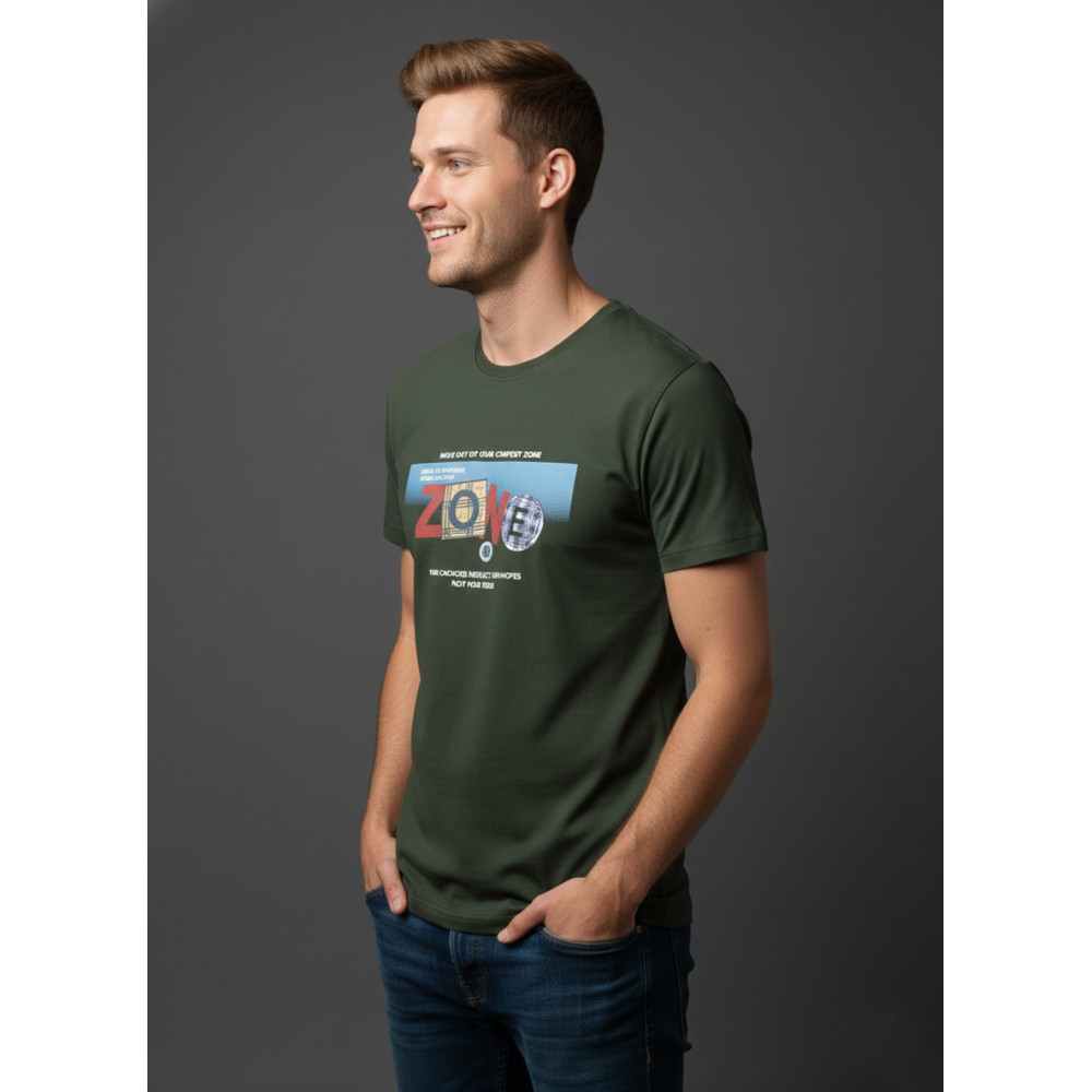 Step up your casual style with this men’s olive green graphic printed T-shirt featuring the powerful “ZONE” motivational print. Designed for men who believe in confident choices and modern fashion, this T-shirt is made from premium cotton fabric that feel