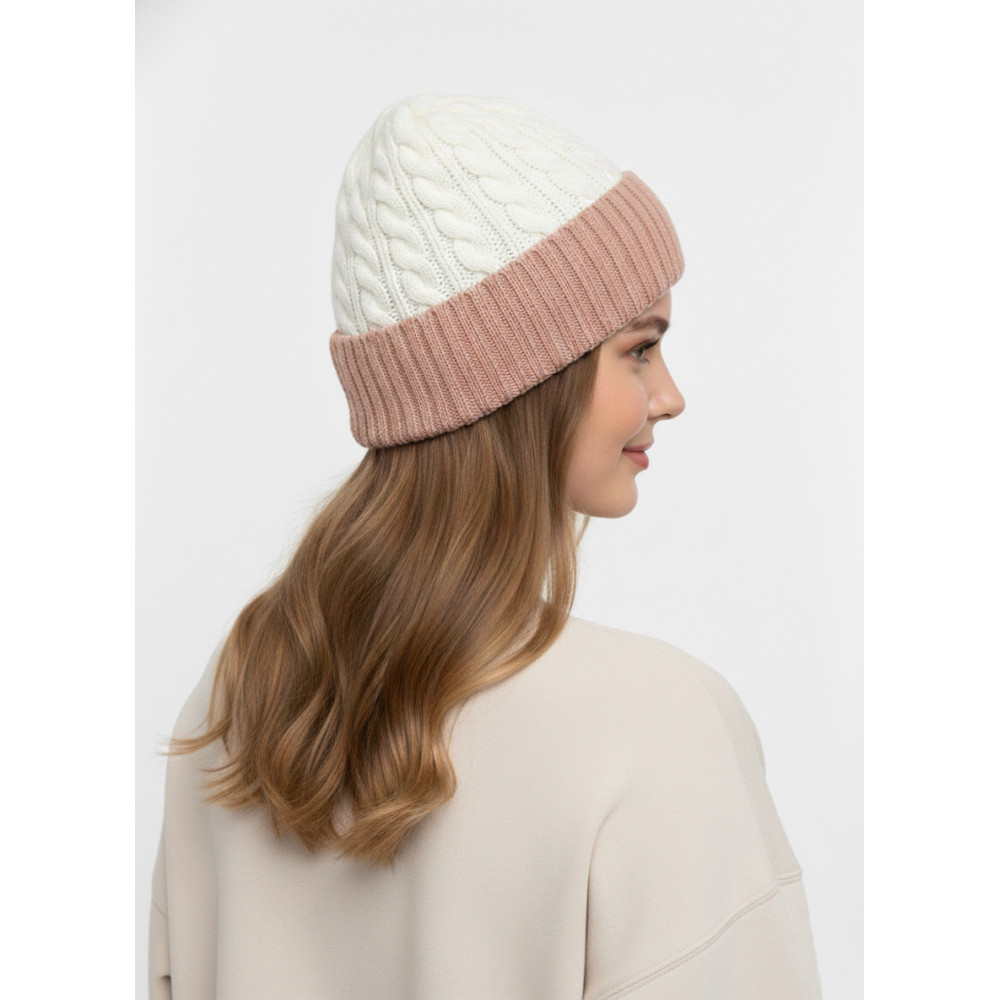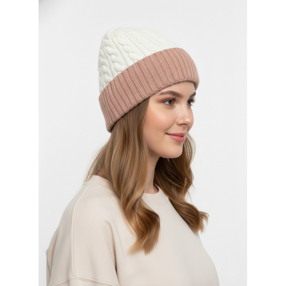 Upgrade your winter style with this elegant dual-tone cable knit beanie. Featuring a beautiful combination of cream and blush shades, this cap blends classic charm with modern fashion. The upper cable-knit pattern adds texture and warmth, while the ribbed fold-over cuff ensures a snug and comfortable fit.